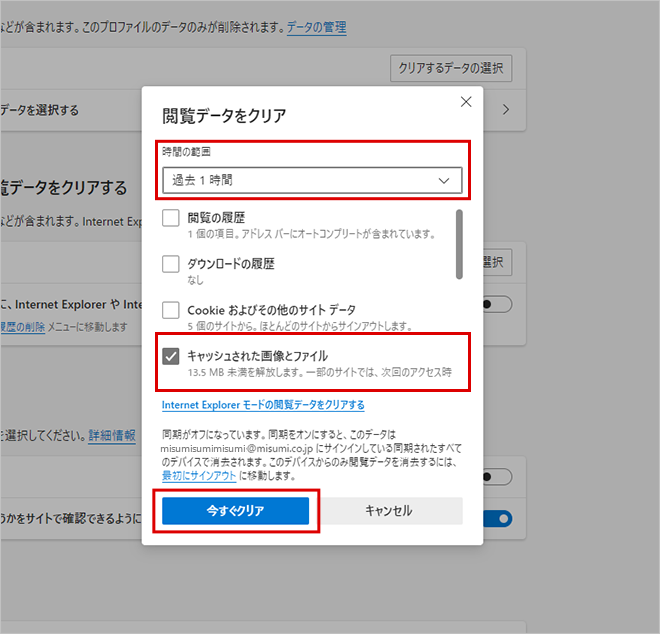 4.期間を選択し、[キャッシュされた画像とファイル]にチェックを入れ、[今すぐクリア]をクリックします。