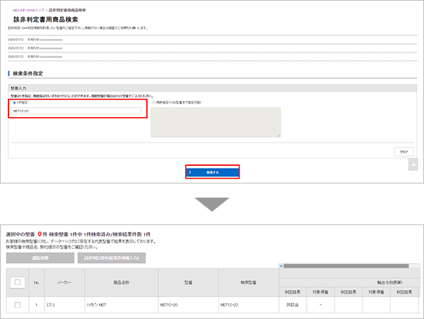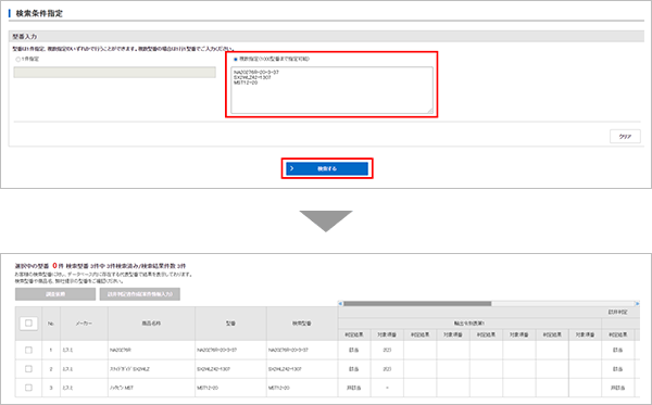 輸出判定情報を確認したい商品型番を入力し、「検索する」をクリック