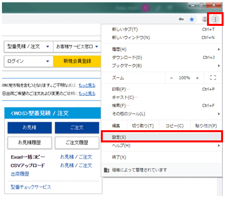 1. Chromeを起動し、画面右上にあるChrome メニューをクリックし、[設定]をクリックします。