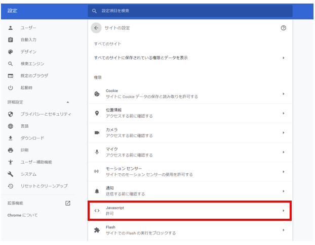 3.[すべてのアクセス許可]のセクションまでスクロールし、[JavaScript]をクリックします。