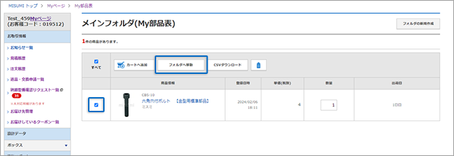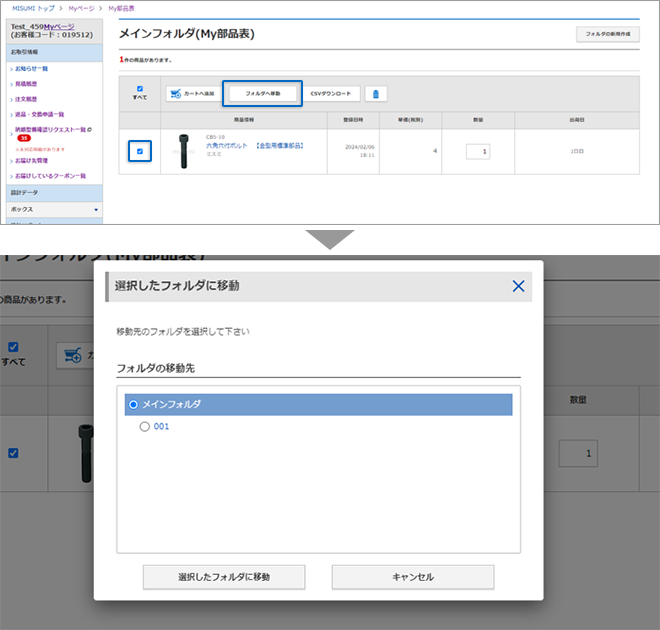 My部品表の中から、移動したいフォルダを選択し、「フォルダへ移動」をクリックします。