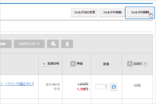 移動先のフォルダを選択し、「選択したフォルダに移動」ボタンをクリックすると、選択したフォルダへ商品が移動します。