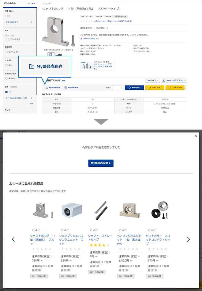 「My部品表保存」ボタンをクリックする事で、My部品表に商品情報が保存されます。
