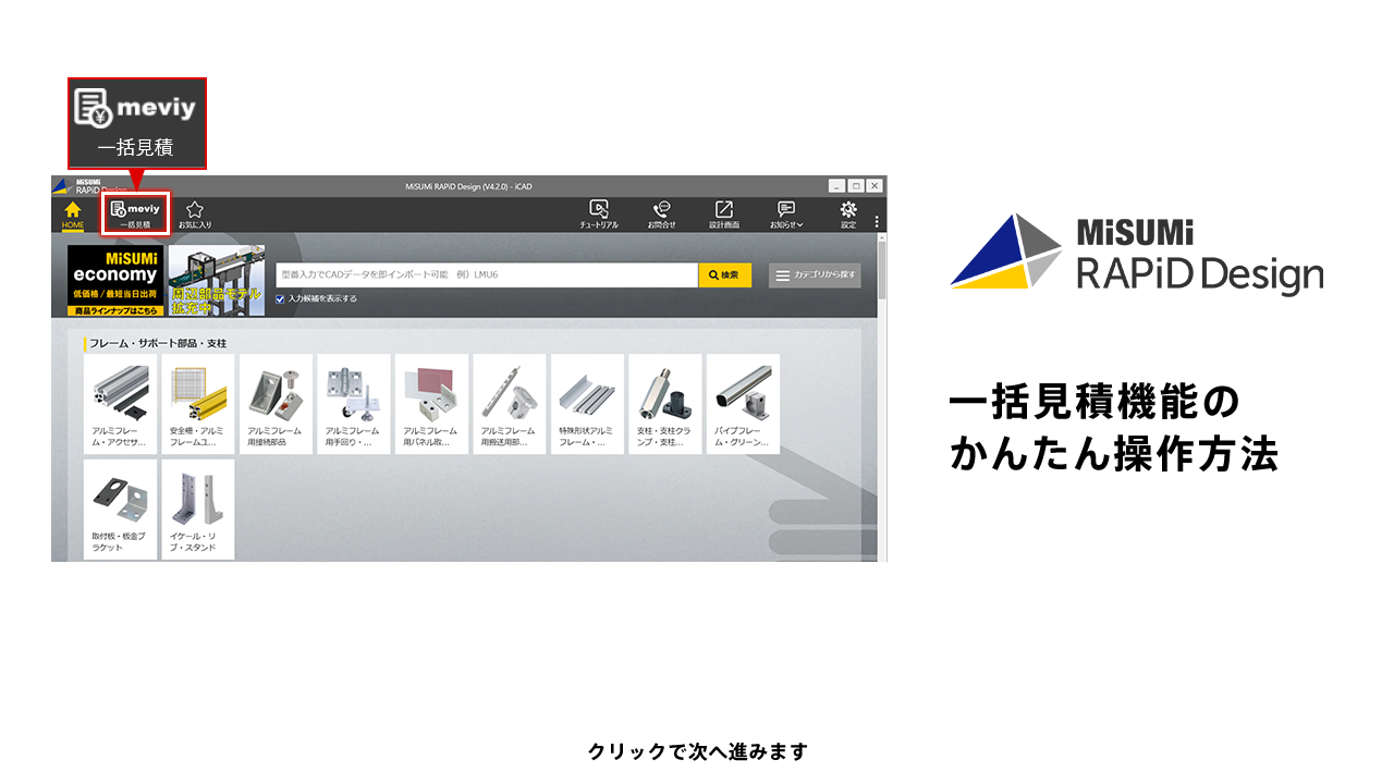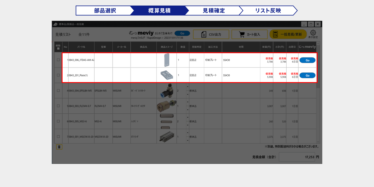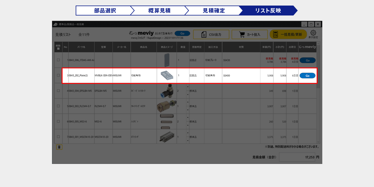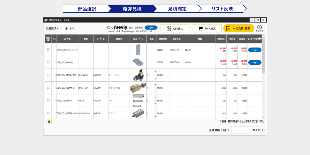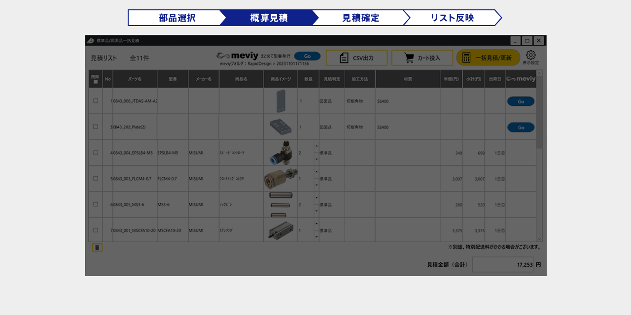 見積リストをCSVファイルで出力と、ミスミサイトの注文画面にカート投入も可能