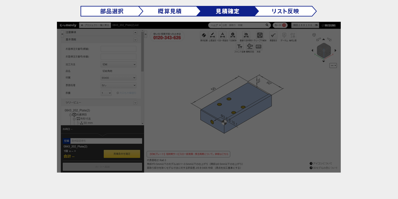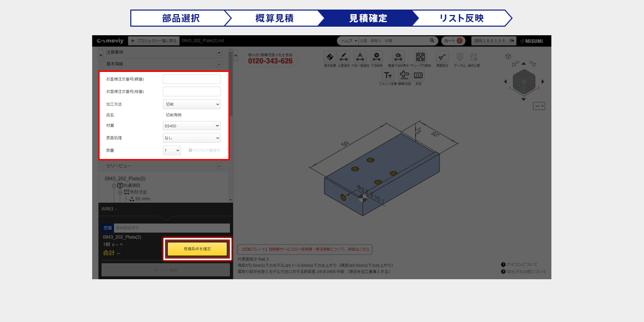 meviyのページへ遷移し、仕様を選択して見積条件を確定ボタンをクリック