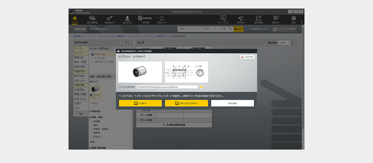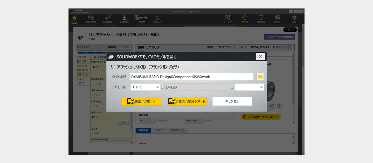 ファイルの保存場所を指定後「新規インポート」または「アセンブリにインポートをクリック」