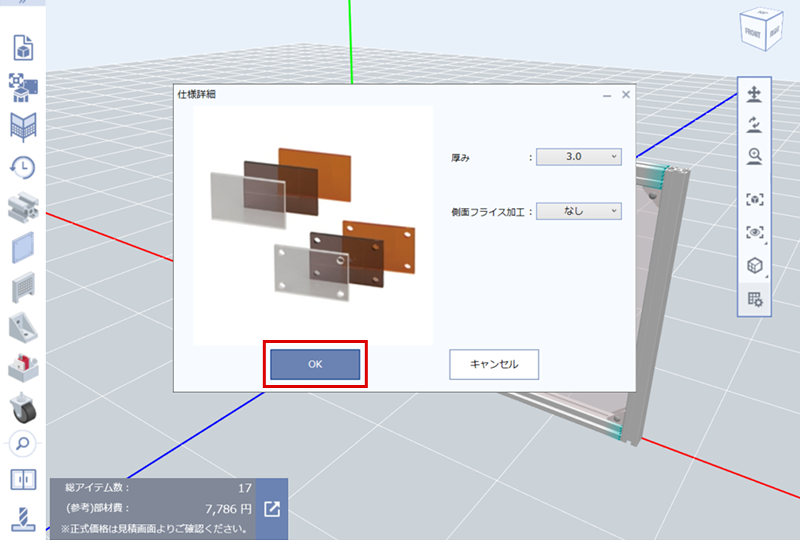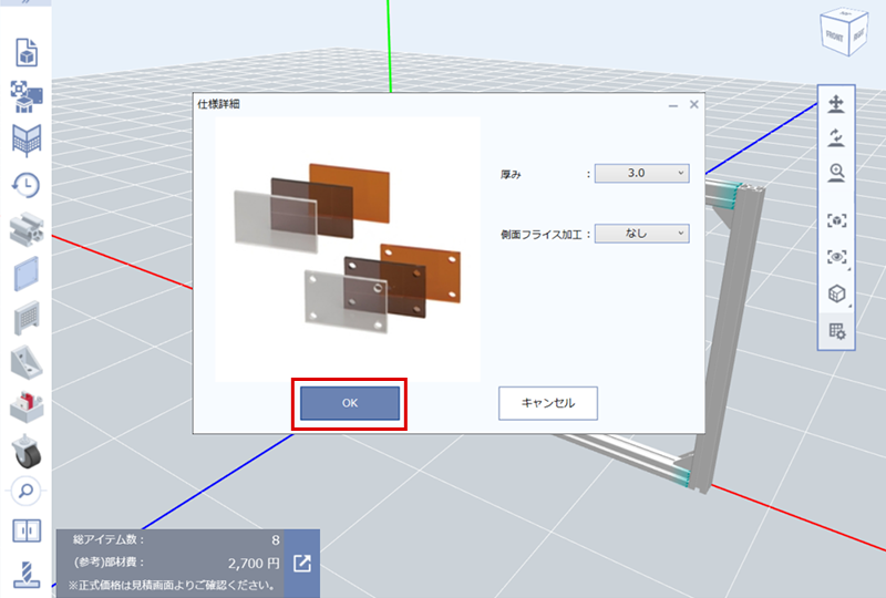 • (3)仕様詳細(パネルの厚み、側面加工)を確認して「OK」