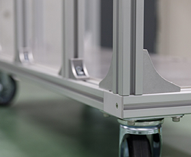 現場では、架台、カート、安全対策の装置カバーなど、アルミフレームを使った設備や什器が数多く利用されていました。同社が生産する工業用ヒーターは、お客さまの要望に応じて製作するオーダーメイドのため、その形状や大きさも多岐にわたります。そのため、設備まわりも多くがオリジナル。一台一台に、現場のニーズが組み込まれています。